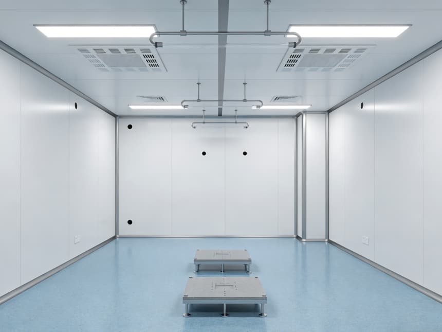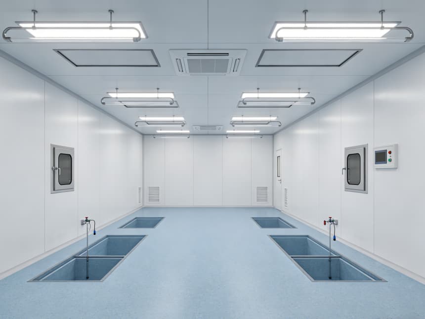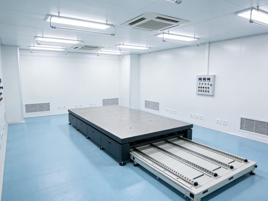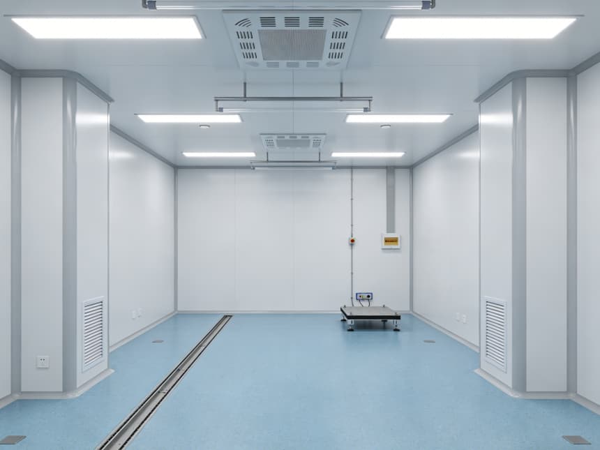 電子光學車間內部細節(jié)設計精準匹配行業(yè)核心需求,整體采用淺藍色防靜電潔凈地坪與白色無縫潔凈墻面的組合,風格簡約統(tǒng)一。地面選用3mm厚環(huán)氧防靜電材質,表面經啞光工藝處理,既能有效規(guī)避強光反射對光學檢測造成的干擾,又具備10?-10?Ω的穩(wěn)定防靜電性能;同時兼具優(yōu)異的耐磨特性,可耐受酒精等常用清潔劑擦拭,墻角均采用50mm圓弧設計,從根源上消除積塵死角,筑牢潔凈基礎。