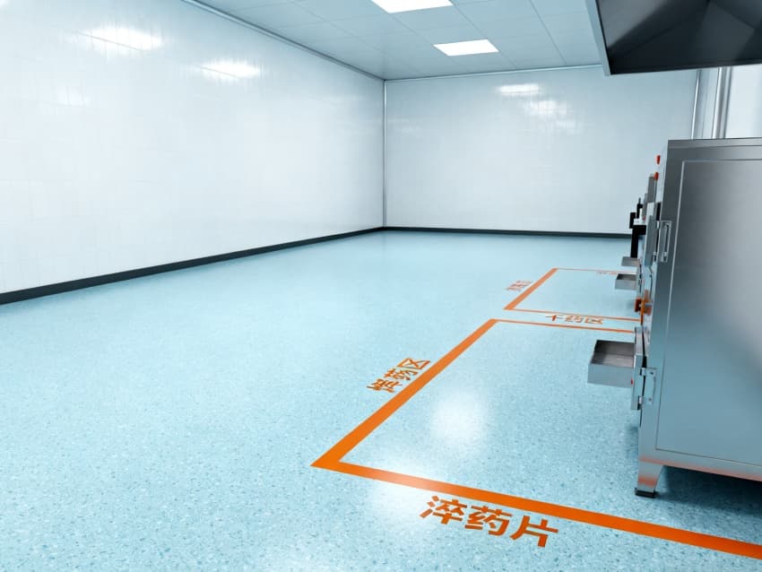 車間整體遵循醫藥級潔凈設計標準,地面采用淺藍色抗菌防滑環氧地坪,通過無縫一體化施工工藝,徹底消除藥渣殘留隱患與衛生死角,其卓越的耐腐蝕性與易清潔特性,能夠從容應對中藥清洗、切制等高頻清潔作業;四周白色防塵抗菌墻面經過特殊工藝處理,具備優異的光線漫反射性能,搭配頂部科學布局的柔和照明系統,既保證操作人員能夠清晰觀察藥材炮制過程中的性狀變化,又為生產環境構筑起一道潔凈無菌的安全屏障。