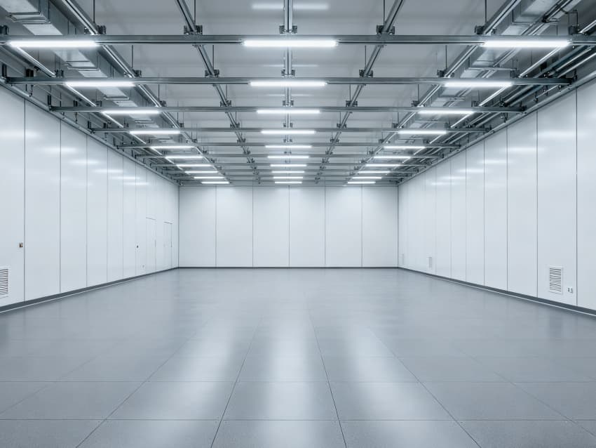 內(nèi)部按功能劃分為六大核心區(qū)域:潔凈生產(chǎn)區(qū)采用無(wú)設(shè)備空曠布局,預(yù)留8-12米柱距滿(mǎn)足光刻機(jī)、刻蝕機(jī)等大型設(shè)備安裝需求;管線(xiàn)集成區(qū)通過(guò)規(guī)整的頂部管線(xiàn)橋架系統(tǒng),實(shí)現(xiàn)水、電、氣、真空系統(tǒng)集中管控,減少管線(xiàn)交叉干擾;潔凈緩沖區(qū)設(shè)置于生產(chǎn)區(qū)入口,搭配墻面通風(fēng)口保障潔凈度過(guò)渡;設(shè)備預(yù)留區(qū)保留開(kāi)闊橫向空間,支持后期工藝動(dòng)線(xiàn)調(diào)整;結(jié)構(gòu)輔助區(qū)通過(guò)角落加固設(shè)計(jì),滿(mǎn)足重型設(shè)備承重需求;墻面潔凈區(qū)采用光滑防污材質(zhì),降低粉塵附著率。整體空間兼顧半導(dǎo)體生產(chǎn)的潔凈標(biāo)準(zhǔn)與功能靈活性,適配合肥半導(dǎo)體產(chǎn)業(yè)發(fā)展需求。