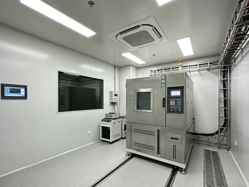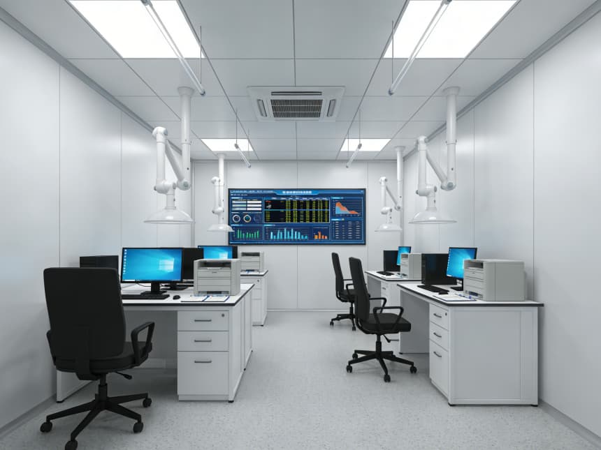 內部檢測空間均以淺灰色耐磨地坪搭配白色無縫潔凈墻面,視覺整潔且適配檢測核心需求。淺灰色地面選用高硬度環氧材質,抗壓耐磨、抗污易清潔,可耐受檢測過程中各類試劑殘留與設備搬運磨損;白色墻面采用環保抗菌涂層,平整度高、反光均勻,搭配嵌入式防眩光照明,為精密檢測提供清晰穩定的視覺環境,減少誤差干擾。