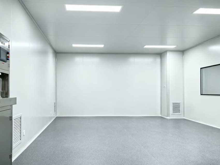 設計在環境適配性上針對性突出:地面采用灰色耐濕熱環氧自流平材質,其特殊配方經121℃高溫滅菌循環測試后硬度無衰減,表面粗糙度Ra≤0.8μm,配合無縫拼接工藝形成連續抗菌屏障,有效阻斷芽孢桿菌等頑固微生物的滋生路徑;四周白色抗菌墻壁選用食品級納米涂層,該涂層經第三方檢測機構驗證,對金黃色葡萄球菌抑菌率達99.9%,配合R≥50mm的圓弧墻角與全密封模塊化吊頂,徹底消除傳統直角結構的積塵隱患。車間頂部集成三級過濾生物安全型層流系統,通過初效、中效、高效過濾器的梯度攔截,配合FFU風機過濾單元實現垂直單向流,可穩定維持ISO7級(萬級)潔凈度,局部配置百級層流罩形成隔離操作區,確保關鍵工序在無菌環境下進行。此外,墻面還預埋了智能溫濕度傳感器陣列,通過物聯網系統實時監控并調節溫濕度參數,為發酵菌種提供最適宜的生長環境。